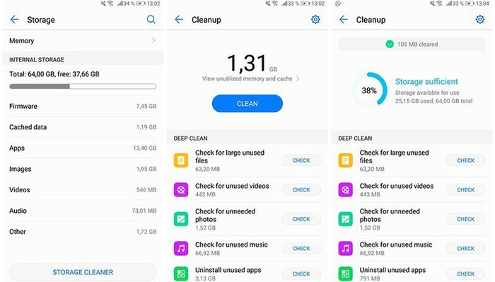 Chúng ta có thể kiểm soát cả 3 yếu tố này. Hãy dành một ít thời gian để dọn dẹp các ứng dụng không sử dụng, xóa đi bộ nhớ cache cồng kềnh và các tệp không cần thiết. Một số hệ điều hành tùy chỉnh của Android, chẳng hạn như EMUI của Huawei cũng có hệ thống dọn dẹp lưu trữ tích hợp, giúp thực hiện việc này nhanh chóng và dễ dàng.