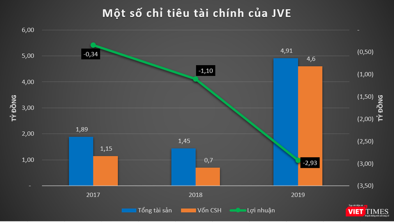 Từ khi thành lập, JVE chưa phát sinh doanh thu, cùng đó là khoản lỗ khoảng 1-3 tỷ đồng mỗi năm. Cụ thể, trong 3 năm 2017, 2018 và 2019, JVE lần lượt báo lỗ 340 triệu đồng, 1,1 tỷ đồng và 2,93 tỷ đồng.