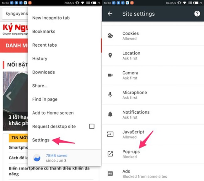 Nếu đang sử dụng trình duyệt Google Chrome, bạn hãy bấm vào biểu tượng menu ở góc trên bên phải, chọn Settings (cài đặt) > Site settings (cài đặt trang web) > Pop-ups và vô hiệu hóa tùy chọn Pop-ups.