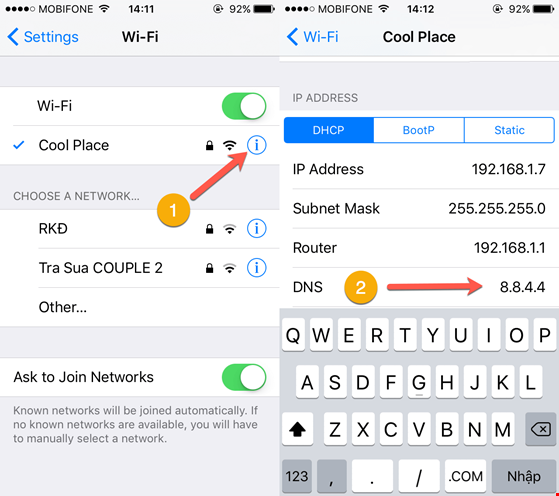- iOS: Đối với các thiết bị iOS (iPhone, iPad hoặc iPod), bạn hãy vào Settings > Wi-Fi, chạm vào biểu tượng chữ “i” ở cuối tên mạng, sau đó kéo xuống bên dưới và cấu hình các thông số tương ứng tại mục DNS. Ví dụ, Google DNS (8.8.8.8, 8.8.4.4), Open DNS (208.67.222.222, 208.67.220.220)…