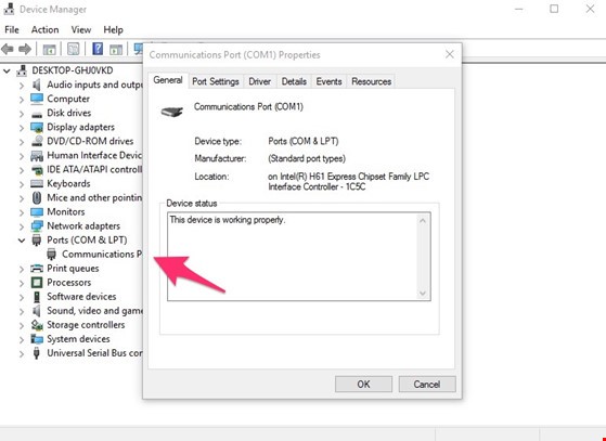- Bước 1: Bạn hãy kích phải chuột vào My computer (hoặc This PC) và chọn Properties > Device manager > Ports > Communications Ports.