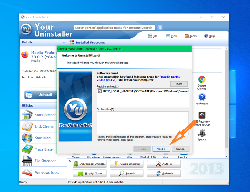 Bước 1: Chạy phần mềm Your Uninstaller. Trên giao diện Your Uninstaller, tất cả các ứng dụng, chương trình bạn đã cài đặt sẽ được liệt kê. Nhấp chuột trái vào ứng dụng cần gỡ bỏ. Thông tin về ngày cài đặt và kích thước ứng dụng đó sẽ được hiển thị trong phần Details ở phía bên trái, các bạn chỉ cần chọn Uninstall.