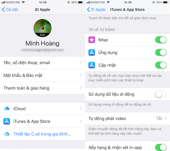 Đầu tiên, bạn hãy truy cập vào phần Settings (cài đặt) > iTunes & App Stores và vô hiệu hóa các tùy chọn gồm Music (nhạc), Apps (ứng dụng) và Updates (cập nhật). Ngoài ra, người dùng cũng nên vô hiệu hóa tính năng làm mới nội dung ở chế độ nền trong phần Settings (cài đặt) > General (cài đặt chung) > Background App Refresh (làm mới nội dung trong nền).