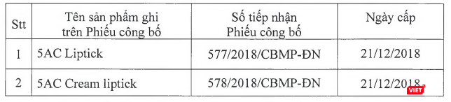 Theo Cục Quản lý Dược, 2 sản phẩm mỹ phẩm 5AC Liptick và 5AC Cream liptick do Công ty TNHH Thương Mại – Dịch vụ Dược Mỹ Phẩm M&M (địa chỉ: 12A/B6, Khu phố Bình Thuận 2, P. Thuận Giao, TX. Thuận An, T. Bình Dương) và Công ty TNHH Young Sung Vina (địa chỉ: Số 19 đường 03A, KCN Biên Hòa II, P. Long Bình Tân, TP. Biên Hòa, T. Đồng Nai) đứng tên công bố và chịu trách nhiệm đưa sản phẩm ra thị trường.