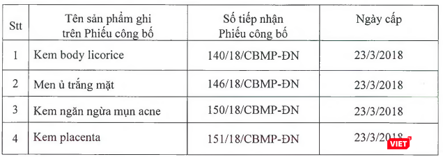4 sản phẩm mỹ phẩm bị thu hồi gồm: Kem body licorice, Men ủ trắng mặt, Kem ngăn ngừa mụn acne và Kem placenta.