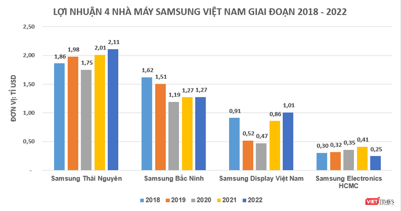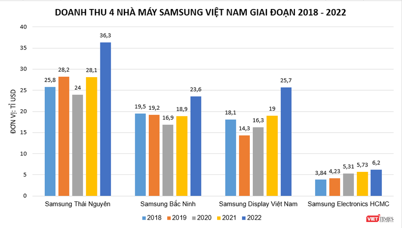Xét cả năm 2022, Samsung Thái Nguyên vẫn là đơn vị đóng góp nhiều nhất về doanh thu tại Việt Nam cho tập đoàn Samsung, đạt mức 28,1 tỉ USD.
