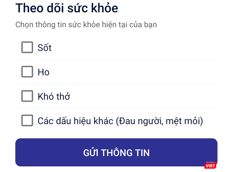 Tại đây, người dùng cần nhập các thông tin cá nhân (họ tên, địa chỉ, số điện thoại,...), cùng với đó là thông tin khai báo về tình trạng y tế (các triệu chứng bệnh, các bệnh nền nếu có,...). Cuối cùng, người dùng nhấn vào ô “Gửi thông tin khai báo y tế” để hoàn tất.