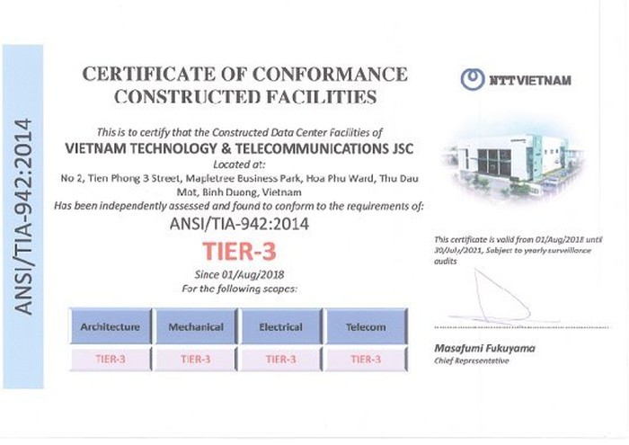 Edatacenter VNTT đạt chứng nhận TIA-942/Tier3 của NTT