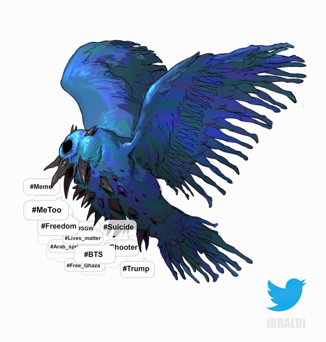Hình tượng Twitter đã được thể hiện xuất sắc dưới bàn tay nghệ thuật của Brahim khi anh hẳn phải am hiểu rất rõ về lịch sử và văn hóa đặc trưng của mạng xã hội này. Tính năng hashtag là nét ấn tượng bắt buộc phải nhắc tới về Twitter khi xuất hiện đầu tiên trên thế giới, tạo trend tới nỗi mọi đối thủ mạng xã hội khác phải học theo.