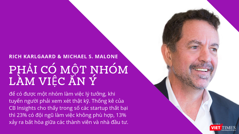 Một số startup vào thời điểm khởi nghiệp đã có một đội ngũ những người rất giỏi chuyên môn, nhưng dần dần sự khác biệt về quan điểm cũng như tính cách, lối sống đã làm cho startup tan rã. Để khởi nghiệp thành công, bạn phải có một đội ngũ làm việc ăn ý, phối hợp tốt với nhau. Rich Karlgaard và Michael S. Malone, đồng tác giả cuốn sách Team Genius đã nói rằng để có được một nhóm làm việc lý tưởng, khi tuyển người phải xem xét thật kỹ. Đúng như vậy, thống kê của CB Insights cho thấy trong số các startup thất bại thì 23% có đội ngũ làm việc không phù hợp, 13% xảy ra bất hòa giữa các thành viên và nhà đầu tư.