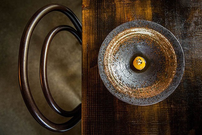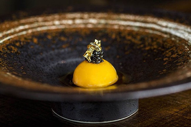 Bên dưới là hai ví dụ về món trứng sous-vide với trứng cá muối và những lá vàng mỏng, món ăn này đẹp hơn khi chụp cận cảnh để những chi tiết nhỏ có thể hiện ra rõ ràng.