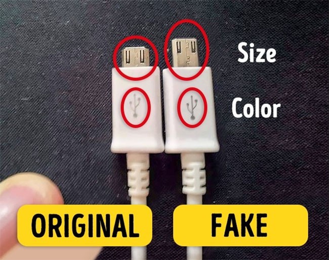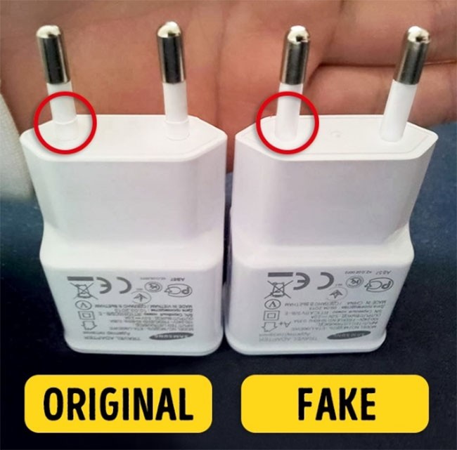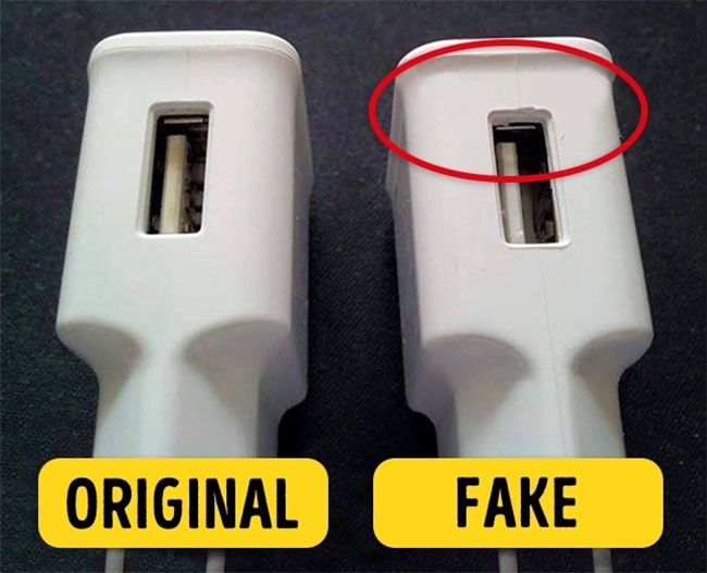 Bộ sạc thương hiệu sẽ không có đường nối giữa các bộ phận bằng nhựa có màu khác nhau. Hãy nhớ rằng, công ty sẽ chịu trách nhiệm về sự an toàn của bạn khi sử dụng các tiện ích của họ. Đó là lý do tại sao bản gốc luôn có các mẹo kim loại gọn gàng và chất cách nhiệt đạt chất lượng.