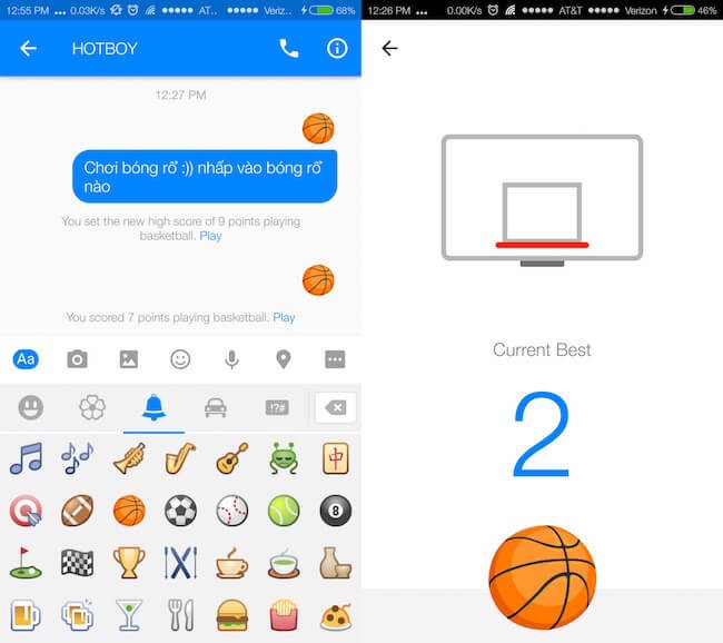 Ngoài việc hỗ trợ nhắn tin, Facebook Messenger còn cung cấp một số trò chơi đơn giản ngay bên trong ứng dụng, đơn cử như cờ vua (@fbchess play), bóng rổ, tâng bóng… Để chơi bóng rổ, bạn chỉ cần gửi biểu tượng bóng rổ cho bạn bè thông qua tin nhắn, sau đó nhấp vào biểu tượng trái bóng để bắt đầu. Tương tự cho trò chơi tâng bóng.