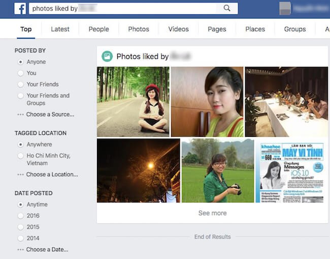 Ngược lại, nếu muốn xem những hình ảnh mà bạn bè đã ẩn khỏi Timelines, bạn chỉ cần sử dụng câu lệnh "photos of <tên bạn bè>". Sau đó, bạn có thể lọc kết quả theo vị trí, thời gian… hoặc nhấn See more để xem toàn bộ.