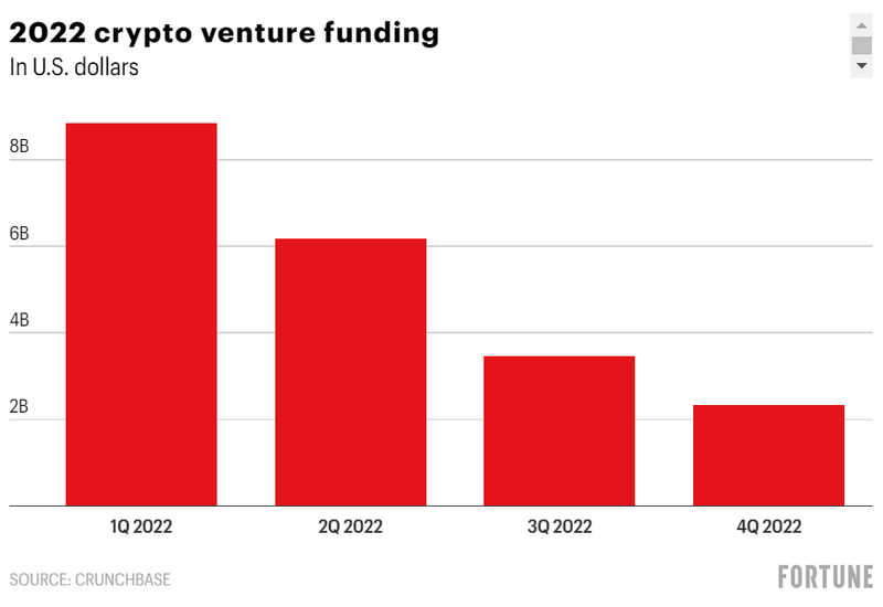 Theo dữ liệu từ Crunchbase, nguồn vốn mạo hiểm cho các công ty khởi nghiệp tiền mã hóa đã giảm đáng kể, từ 8,8 tỉ USD trong quý 1/2022 xuống còn 6,2 tỉ USD trong quý 2/2022 và còn 3,4 tỉ USD trong quý 3/2022.