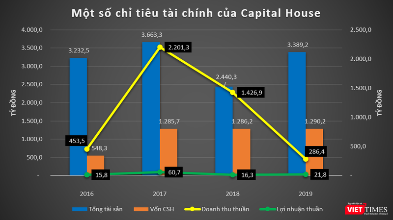 Tính đến cuối năm 2019, tổng tài sản của Capital House đạt 3.389 tỷ đồng, tăng 38,89% so với thời điểm đầu năm; vốn chủ sở hữu tăng nhẹ lên mức 1.290,2 tỷ đồng.