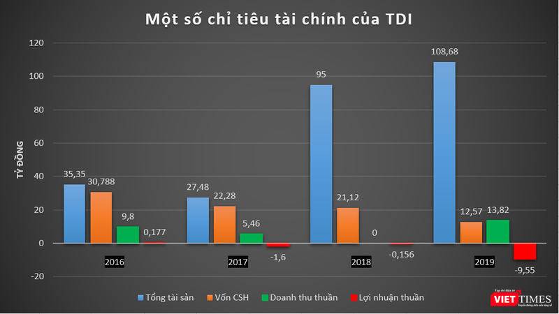 Trong giai đoạn 2016 – 2019, TDI chỉ báo lãi duy nhất vào năm 2016 với số tiền 177 triệu đồng. Các năm sau đó, từ 2017 – 2019, doanh nghiệp này lần lượt báo lỗ 1,6 tỷ đồng, 156 triệu đồng và 9,55 tỷ đồng.