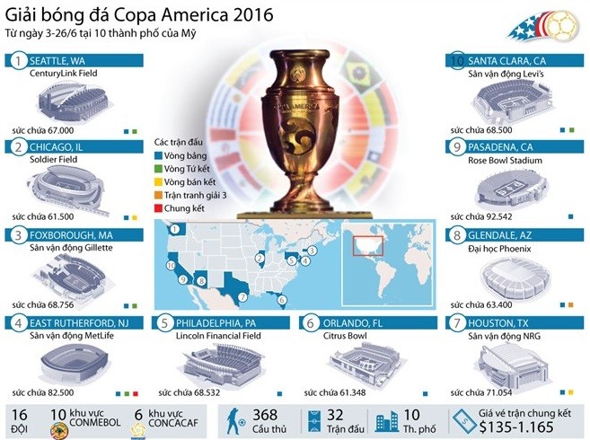 Các trận đấu tại Copa America 2016 sẽ diễn ra trên 10 sân.