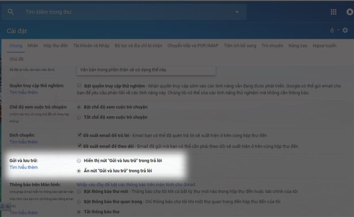 Nếu bạn muốn dọn dẹp hộp thư đến mà không xóa email của mình thì bạn có thể lưu trữ hoặc ẩn chúng. Email của bạn được chuyển đến một nhãn được gọi là Tất cả thư. Để thiết lập, hãy nhấp vào biểu tượng bánh răng ở trên cùng bên phải và đi tới Cài đặt > Chung > Gửi và lưu trữ, chọn Hiển thị nút "Gửi và lưu trữ" trong trả lời rồi cuộn xuống và nhấn nút Lưu thay đổi.