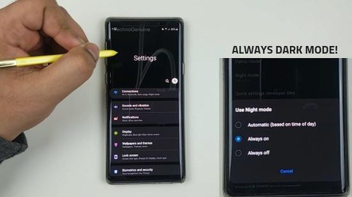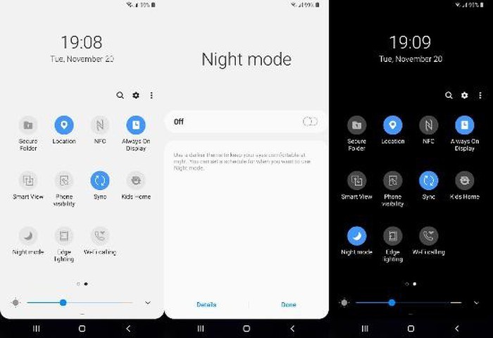 Chế độ này sẽ giảm ánh sáng xanh phát ra từ màn hình điện thoại, giúp giảm mỏi mắt, giảm mệt mỏi và giúp người dùng ngủ dễ hơn khi sử dụng điện thoại vào ban đêm. Nhưng Galaxy S10 không chỉ có chế độ tối (Dark Mode) mà còn cả theme tối tích hợp.