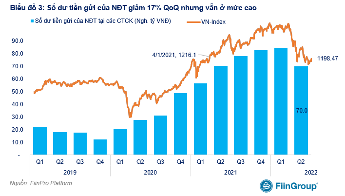 Theo đó, tính đến ngày 30/6, số dư tiền gửi của nhà đầu tư (NĐT) trên tài khoản ở các công ty chứng khoán (CTCK) mà FiinTrade tổng hợp giảm 14.400 tỉ đồng, tương đương 17% so với cuối quý 1/2022.
