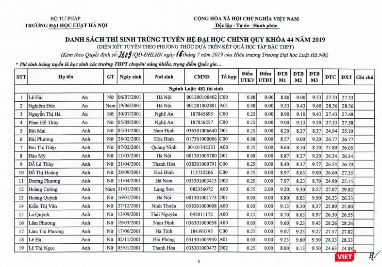 VietTimes -- Trường Đại học (ĐH) Luật Hà Nội vừa công bố danh sách thí sinh trúng tuyển hệ ĐH chính quy khóa 44 năm 2019.