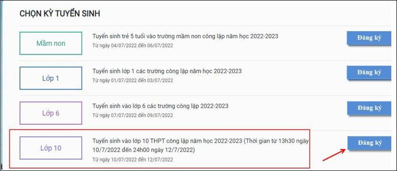 Bước 3: Chọn “Đăng ký tuyển sinh”, giao diện hiển thị các kỳ tuyển sinh, học sinh/phụ huynh chọn kỳ tuyển sinh vào lớp 10 công lập năm 2022-2023 và nhấn nút “Đăng ký”.