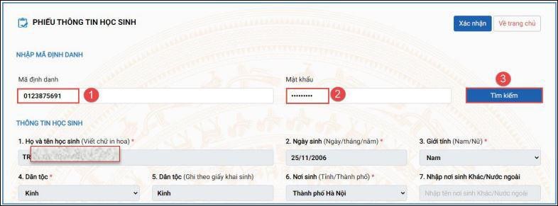 Bước 4: Học sinh/phụ huynh nhập mã định danh, mật khẩu và nhấn nút “Tìm kiếm” (mã định danh và mật khẩu đã được trường THCS cấp cho học sinh cuối cấp trước đó)