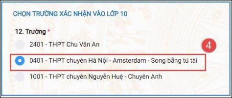 Bước 5 : Chọn trường xác nhận nhập học vào lớp 10 (theo kết quả trúng tuyển nguyện vọng đăng ký vào lớp 10).