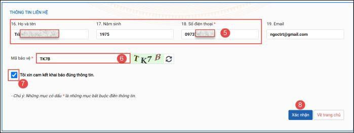 Bước 6 : Kiểm tra, bổ sung các thông tin về gia đình, thông tin liên hệ (đặc biệt lưu ý số điện thoại liên hệ) sau đó nhập Mã bảo vệ, tích cam kết khai báo thông tin và nhấn “Xác nhận”