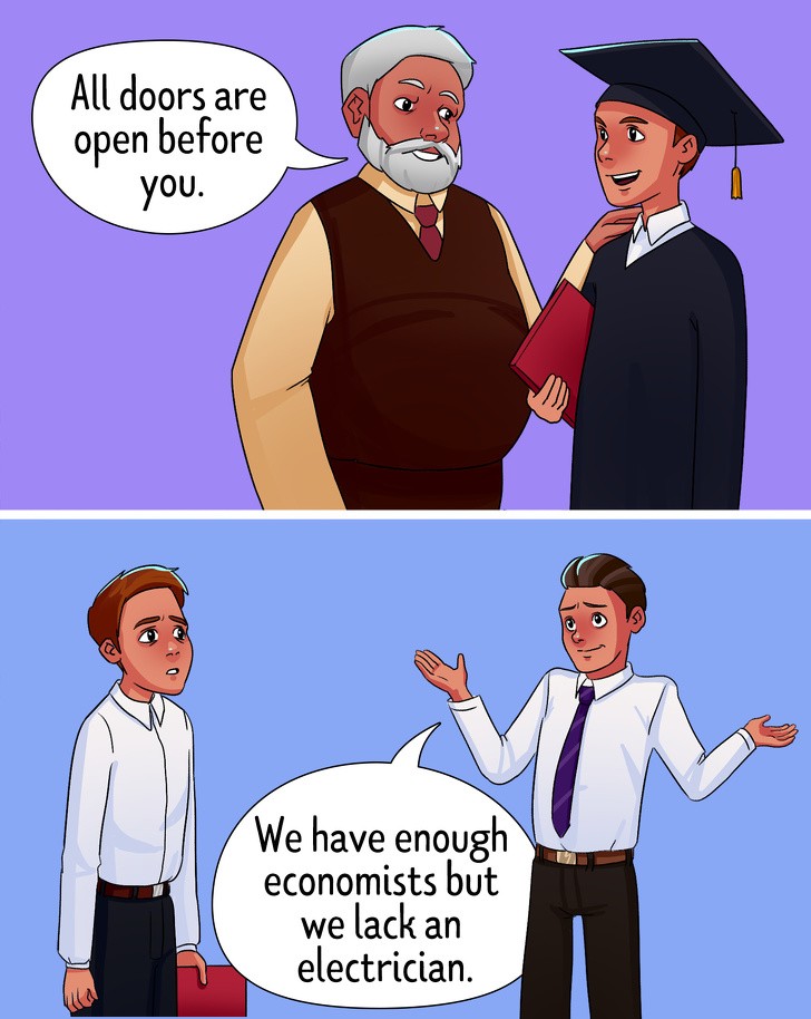 Kết quả là, chúng ta gần như hoàn toàn mất đi sự tôn trọng đối với công việc đơn giản. Hầu như không có bất kỳ học sinh nào ngày nay có thể công khai tuyên bố rằng họ muốn trở thành thợ may hoặc thợ điện. Ngoài ra, nếu bạn được sinh ra trong một gia đình có truyền thống bác sĩ, bạn hãy sớm từ bỏ ý nghĩ trở thành thợ cắt tóc trong đầu ngay lập tức bởi chẳng có ai ủng hộ bạn đâu.
