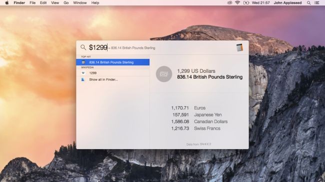 Ví dụ gõ “$1299” vào và Spotlight sẽ ngay lập tức cung cấp giá trị số tiền đó dưới dạng VNĐ (nếu bạn đã chỉnh đơn vị tiền mặt gốc trong mục Language & Region ở Control Panel là VNĐ) đồng thời ở góc dưới, Spotlight cung cấp giá trị số tiền đó dưới dạng Euro, đồng Yên nhật và nhiều đơn vị khác.