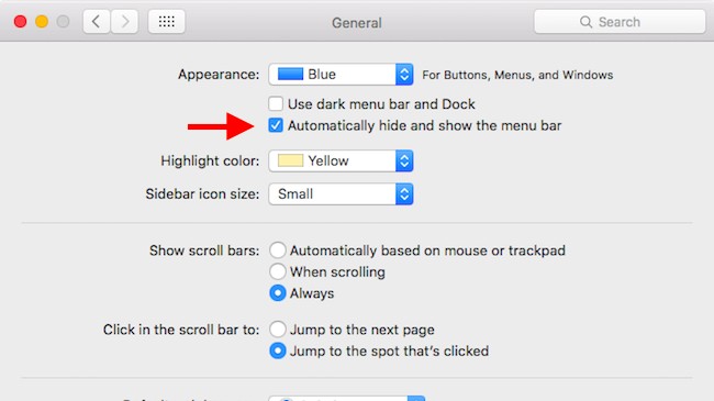 Từ ngày đầu ra mắt năm 1984, thanh Menu Bar trên Mac vốn không thể bị ẩn. Tuy nhiên từ phiên bản OS X El Capitan, bạn đã có thể giấu thanh menu đi. Mở System Preferences, vào mục General rồi chọn Automatically hide and show the menu bar.