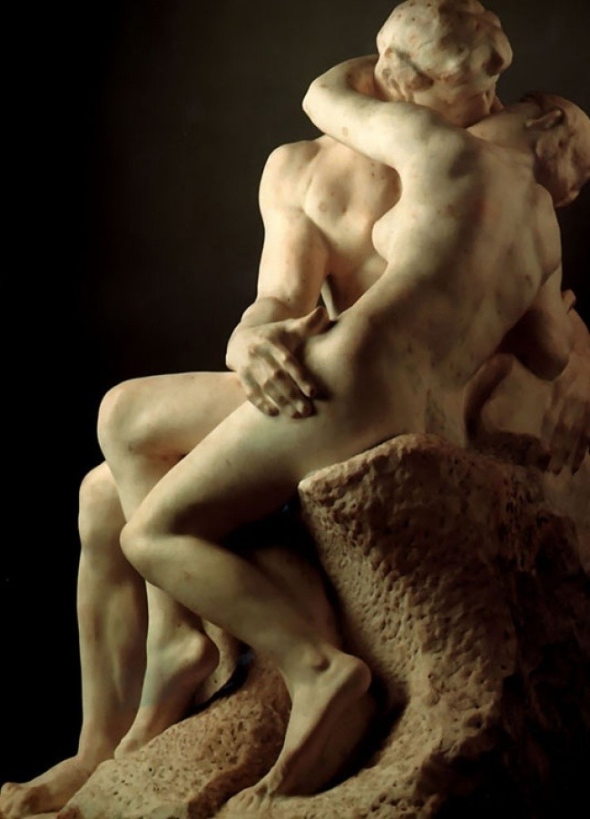 Bức điêu khắc "Nụ hôn" ban đầu mang tên "Francesca da Rimini", đặt theo tên một phụ nữ quý tộc người Ý vào thế kỷ XIII. Bà đã yêu chính em trai chồng mình và bị chính người chồng phát hiện. Người chồng khi phát hiện hai người đang đọc sách cùng nhau đã giết chết cả hai.