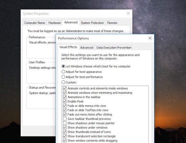 Nếu đang sử dụng Windows, bạn nhấn tổ hợp phím Win + S và gõ vào khung tìm kiếm từ khóa View advanced system settings, Performance > Settings. Sau đó, bạn đánh dấu vào tùy chọn Adjust for best performance để tắt bớt các hiệu ứng đặc biệt và ảnh động.