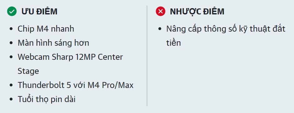 Màn hình: Liquid Retina XDR | Kích thước màn hình: 14 hoặc 16 inch | Tốc độ làm mới màn hình: 120Hz | CPU: Apple M4 | Bộ nhớ đã cài đặt: Lên đến 128GB | Dung lượng lưu trữ: Lên đến 8TB | Trọng lượng: 1,6 kg | Tuổi thọ pin: Lên đến 24 giờ | Kích thước: 12,31 x 8,71 x 0,61 inch (14 inch), 14,01 x 9,77 x 0,66 inch (16 inch) | Các cổng có sẵn: HDMI, giắc cắm tai nghe 3,5 mm, MagSafe 3, 3 cổng Thunderbolt 5, khe cắm thẻ SDXC.
