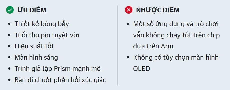 Bên trong, trình giả lập Prism của Microsoft gần như đã phá vỡ hoàn toàn rào cản giữa kiến trúc ARM và x86, vì vậy ngoài chơi game, hầu như tất cả các ứng dụng yêu thích của người dùng đều hoạt động trơn tru. Thêm vào đó là màn hình 120Hz rực rỡ và chất lượng hoàn thiện tốt, đây là một chiếc laptop rất đáng mua.