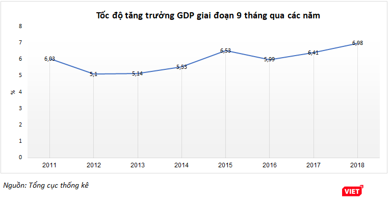 Tính chung giai đoạn 9 tháng năm 2018 (9T/2018), GDP ước tính tăng 6,98% so với cùng kỳ năm trước, mức tăng cao nhất của 9 tháng kể từ năm 2011 trở về đây.