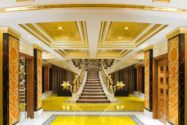 Bên trong khách sạn Burj Al Arab được trang hoàng bằng gần 1.790 m2 lá vàng 24 carat để trang trí. Khách sạn sử dụng đủ số vàng để bao phủ bức tranh Mona Lisa 46, 265 lần!
