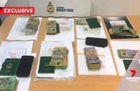 Hình ảnh từ bản tin của 7News thể hiện rõ các cuốn hộ chiếu mang quốc huy Việt Nam trong tang vật vụ việc. (Ảnh cắt từ clip) |