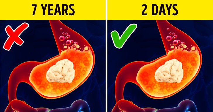 Khi còn nhỏ, hầu như ai cũng ít nhất một lần vô tình nuốt phải kẹo cao su và cũng từng mất ăn mất ngủ vì những lời đồn rằng sẽ bị dính ruột hay phải mất đến 7 năm thì mới có thể tiêu hóa hết kẹo cao su. Mặc dù cơ thể chúng ta không thể tiêu hóa được kẹo cao su nhưng bã kẹo cũng sẽ không cư ngụ mãi mãi trong bụng mà cơ thể sẽ đào thải nó ra ngoài cùng các loại hạt khó tiêu khác. Và tất nhiên sẽ không mất đến 7 năm!