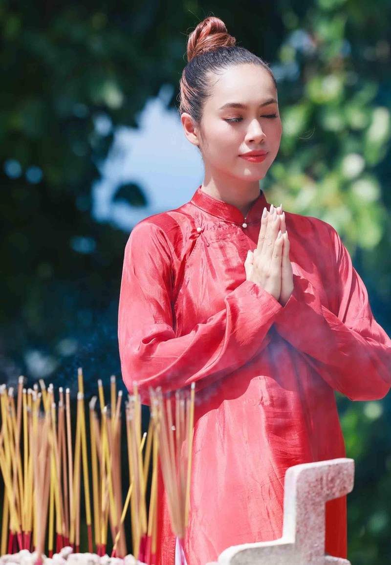 Đến nay, ngôi chùa dần trở thành một nơi nguy nga tráng lệ với kiến trúc đặc sắc ấn tượng, là một trong những ngôi chùa rất linh thiêng ở Tây Ninh. Đó là lý do Hoàng My chọn cho mình chiếc áo dài tím đơn sắc, nhã nhặn, dịu dàng khi thực hiện loạt ảnh tại Chùa Thiền Lâm.