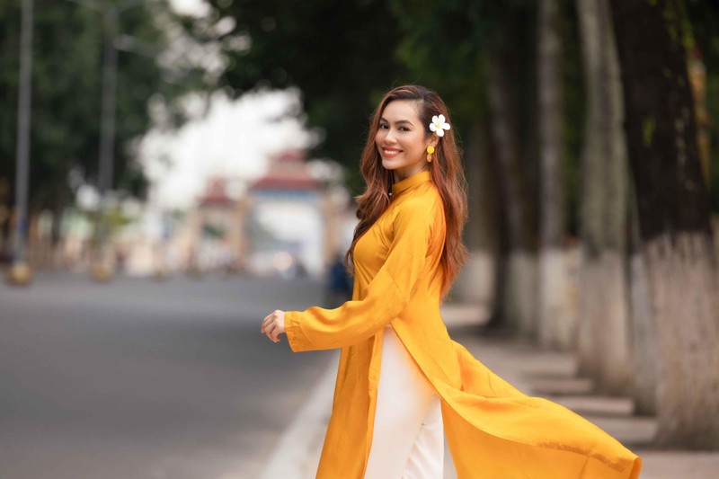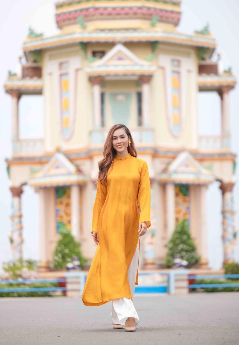 Diện trên mình thiết kế áo dài cách tân màu vàng rực rỡ, Hoàng My nhẹ nhàng khoe nhan sắc dưới ánh nắng chiều Tây Ninh. Đây cũng là một trong những shoot hình mà nàng hậu hài lòng nhất trong chuyến đi lần này.