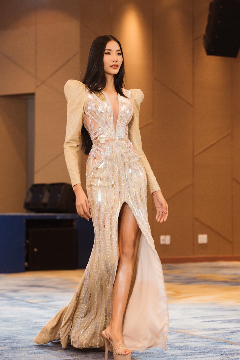 Trong phần catwalk với trang phục dạ hội, Hoàng Thùy được diện hai bộ trang phục với hai phong cách khác nhau: một bộ ôm sát khoe đường cong cơ thể và một bộ bay bổng để cô có thể thoải mái catwalk.