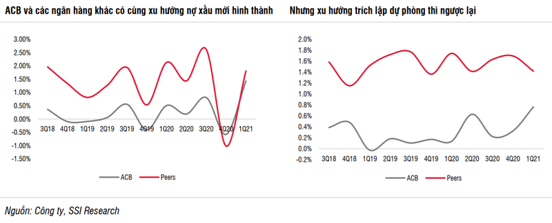 Trong báo cáo cập nhật mới nhất về Ngân hàng TMCP Á Châu (Mã CK: ACB), CTCP Chứng khoán SSI (SSI) cho biết nợ nhóm 2 và tỷ lệ nợ xấu tại cuối Quý 1/2021 của ACB đã tăng lên 0,32% và 0,91%, cao hơn so với mức 0,18% và 0,59% vào cuối năm 2020.