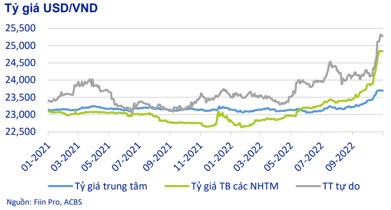 Theo ACBS, diễn biến này chủ yếu là do áp lực ngày càng tăng từ các đợt tăng lãi suất mạnh mẽ của Cục dự trữ Liên bang Mỹ (FED). Trên thị trường tự do, tỷ giá USD/VND có thời điểm tăng lên mức kỷ lục ở mức 25.325 đồng/USD.