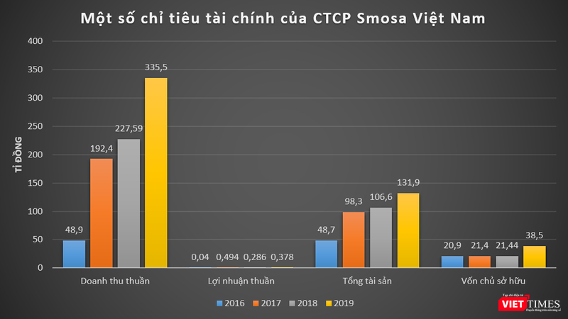 Dữ liệu của VietTimes cho thấy, trong 4 năm trở lại đây, Smosa luôn tăng trưởng mạnh về doanh thu, song lợi nhuận thu được lại rất thấp. Như năm 2019, Smosa ghi nhận doanh thu thuần đạt 335,5 tỉ đồng, báo lãi thuần ở mức 378 triệu đồng, tương ứng với biên lợi nhuận 0,1%.