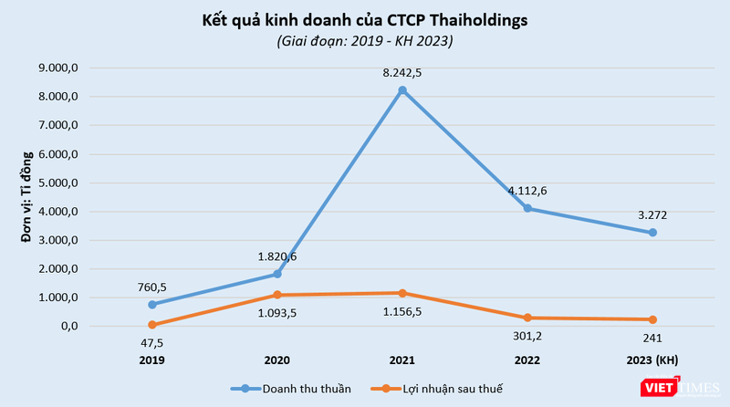 Năm 2023, Thaiholdings đặt mục tiêu doanh thu thuần hợp nhất đạt 3.272 tỉ đồng, giảm 20,4% so với năm trước.