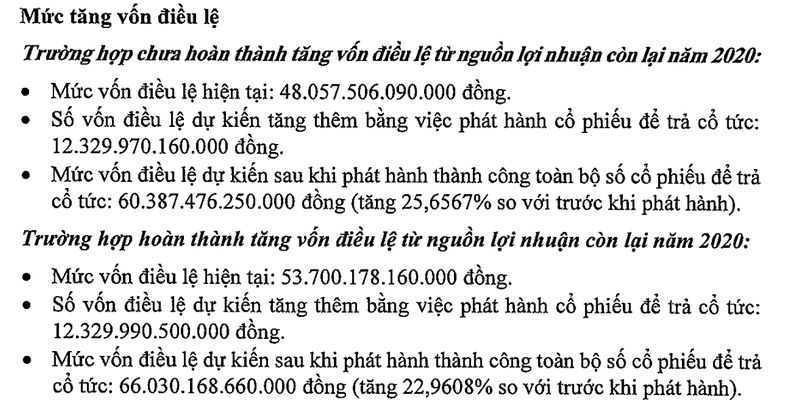 Trong trường hợp VietinBank chưa hoàn thành tăng vốn điều lệ từ nguồn lợi nhuận còn lại của năm 2020, quy mô vốn điều lệ của VietinBank sau khi phát hành cổ phiếu trả cổ tức sẽ ở mức 60.487,4 tỉ đồng.