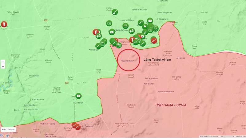 Phóng viên chiến trường Al Masdar News dẫn nguồn tin quân sự Syria thuộc tỉnh Hama cho biết: lực lượng chiến binh thánh chiến đã xông vào tuyến phòng thủ quân đội Syria gần làng Taybat Al-Ism.